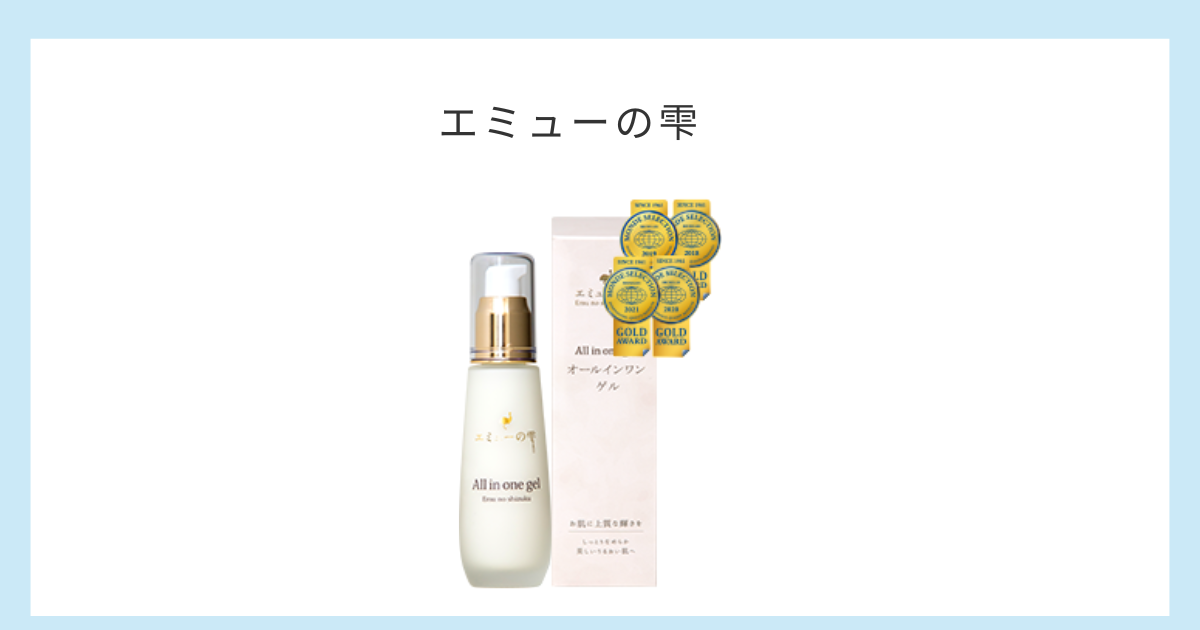 エミューの雫オールインワンゲルは、エミューオイル、エラスチン、プロテオグリカンなどの美容成分が高密度に配合され、肌にうるおいを与え、くすみやしわ、たるみを改善します。6年連続でモンドセレクション金賞を受賞しており、その品質は高く評価されています。一つで化粧水から化粧下地までの役割を果たすため、スキンケアが手軽にできます。